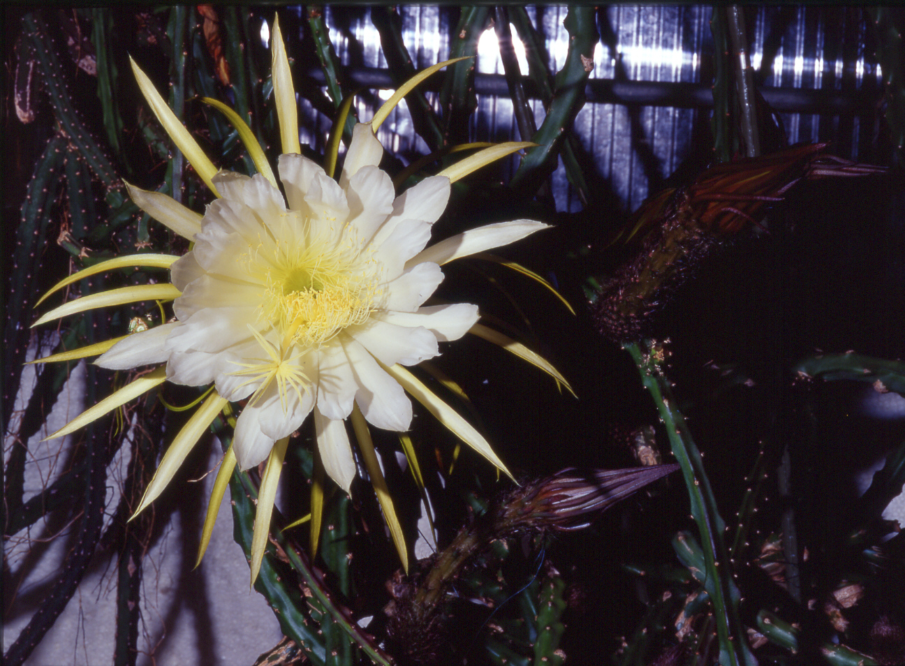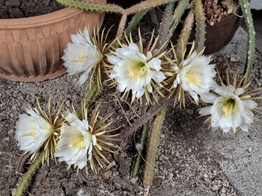 Sechs Blüten öffneten in einer Nacht. Die "Königin" hat die größten Kakteenblüten, die bis zu 40cm Durchmesser erreichen können, dazu muss sie aber gut gedüngt werden, am besten mit Kuhmist und Humus. Ihre Artgenossin S. macdonaldiae hatte das Gewächshaus als riesiges Gestrüpp überwachsen und in einer Nacht 65 Blüten geöffnet, ___________________