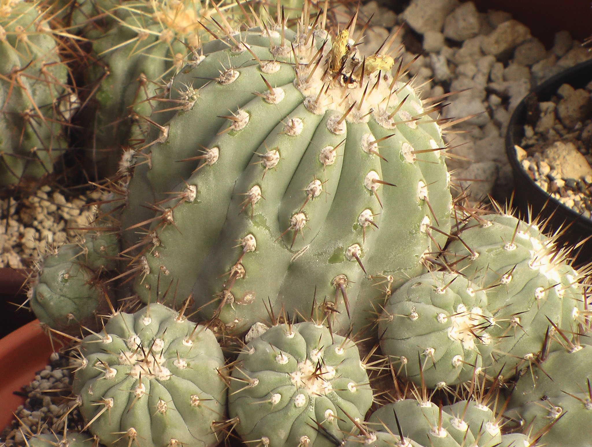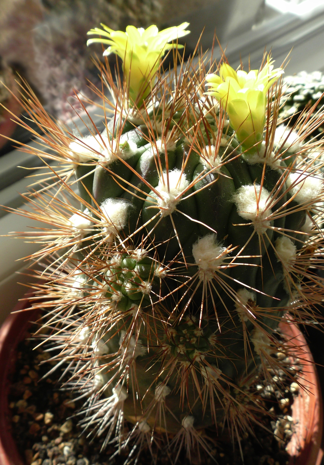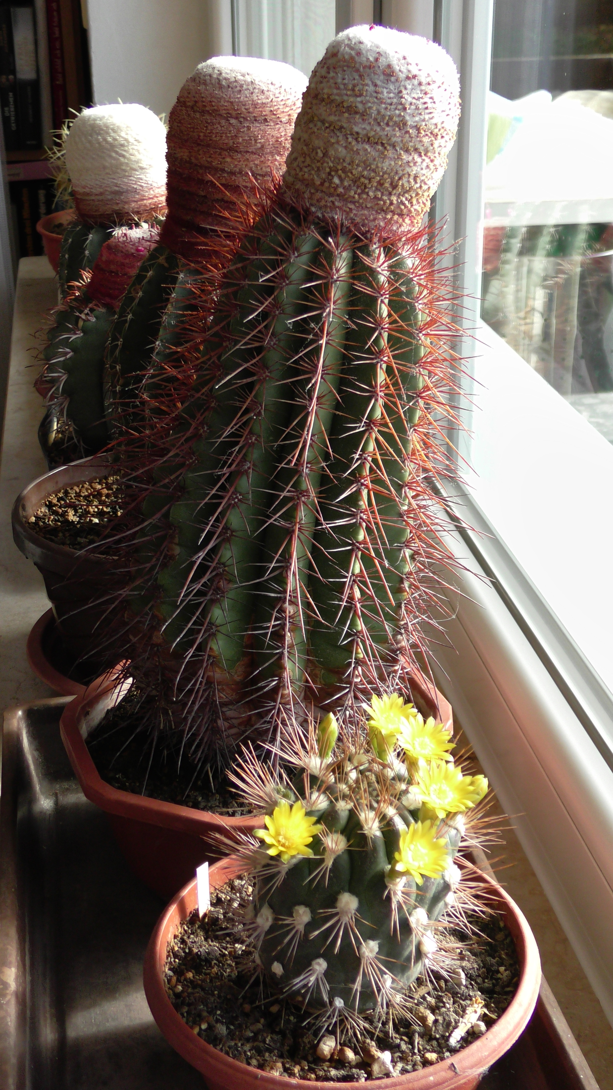 Weingartia pucaraensis und Weingartia insignis treffen sich auf 2500m Höhe, doch Liebe gibt es nicht, denn eine blüht im Frühjahr und die andere im Herbst. Aber es muss wohl doch eine Möglichkeit geben und vielleicht mischt da auch noch ein anderer mit? Eines dieser seltsamen Geschöpfe steht zur Überwinterung am Fensterbrett, es ist der 19. Januar und es blüht. Sie hat ausgefallene Merkmale: In der Jugend und als Kindel am Stamm braungefärbte Epidermis, die sich dann in der Sonne in grün verwandelt. Sie wächst säulenförmig 22cm hoch und 5cm im Durchmesser (im Gewächshaus in voller Sonne, also kein Lichtmangelaustrieb), ihre Kindeln sprossen aus einer Spiralkante von unten bis oben und sie blüht mit wenigen Unterbrechungen fast das ganze Jahr. Was hat der Pucara-Experte da auf dem Berg gefunden? Es bleibt ein Rätsel.