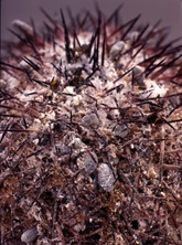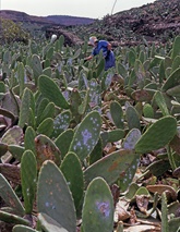 ...sollte jeder Kenntnis davon haben, um nicht befallene Kakteen zu erwerben. Die Schmier- oder Wolllaus liebt Kakteen und ist zugleich ihr größter Feind. Schon vor langer Zeit färbte man mit dem Farbstoff Karmin aus dem Blut der weiblichen Cochenillelaus die Kardinalsgewänder und Lippenstifte. Auch heute soll dies noch der Fall sein. Um sie zu züchten gibt es auf Lanzarote Opuntienfelder, wo die Läuse in Kulturen auf Blättern der Opuntia ficus-indica angesetzt werden.