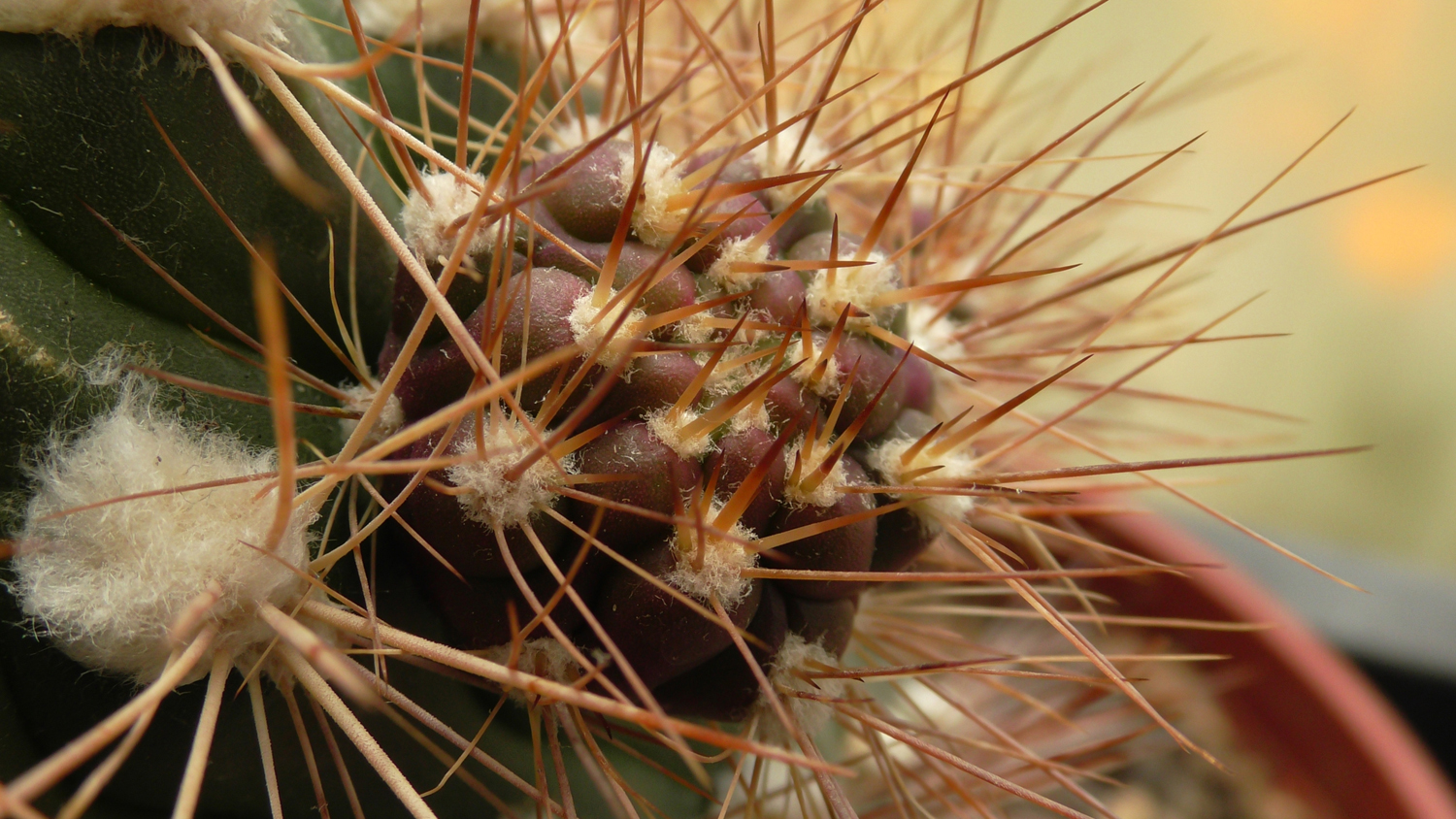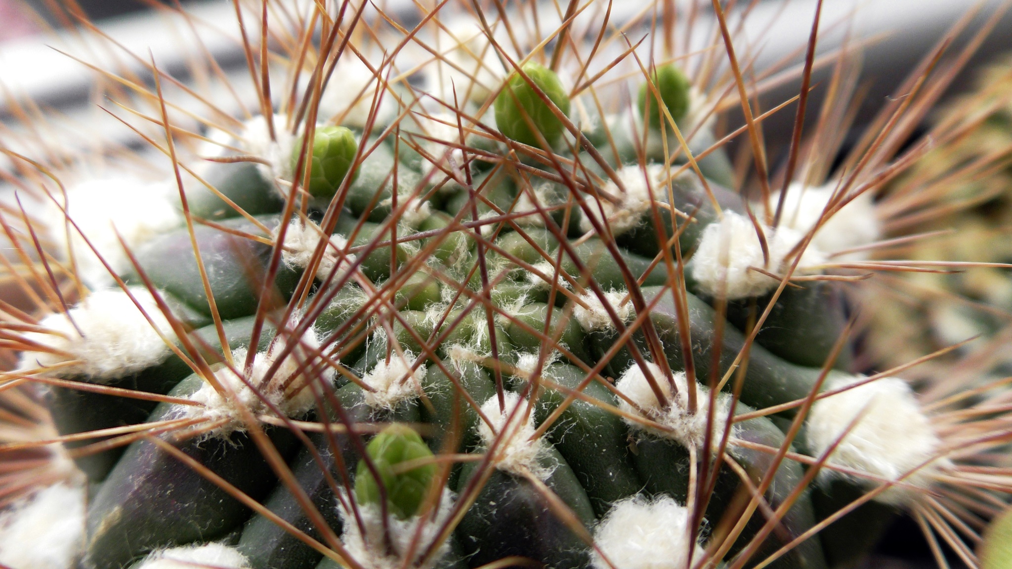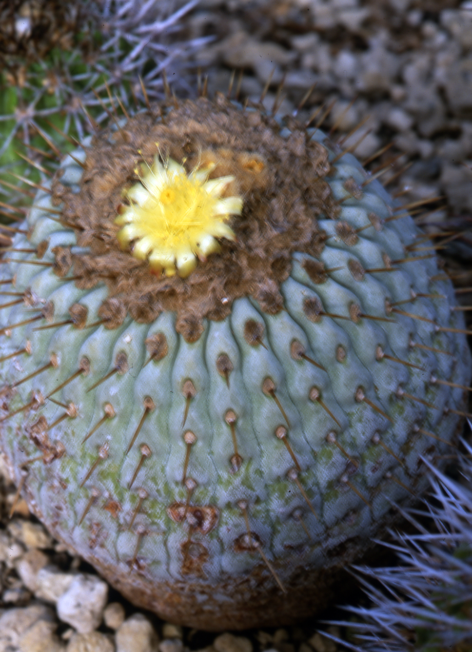 Weingartia pucaraensis und Weingartia insignis treffen sich auf 2500m Höhe, doch Liebe gibt es nicht, denn eine blüht im Frühjahr und die andere im Herbst. Aber es muss wohl doch eine Möglichkeit geben und vielleicht mischt da auch noch ein anderer mit? Eines dieser seltsamen Geschöpfe steht zur Überwinterung am Fensterbrett, es ist der 19. Januar und es blüht. Sie hat ausgefallene Merkmale: In der Jugend und als Kindel am Stamm braungefärbte Epidermis, die sich dann in der Sonne in grün verwandelt. Sie wächst säulenförmig 22cm hoch und 5cm im Durchmesser (im Gewächshaus in voller Sonne, also kein Lichtmangelaustrieb), ihre Kindeln sprossen aus einer Spiralkante von unten bis oben und sie blüht mit wenigen Unterbrechungen fast das ganze Jahr. Was hat der Pucara-Experte da auf dem Berg gefunden? Es bleibt ein Rätsel.